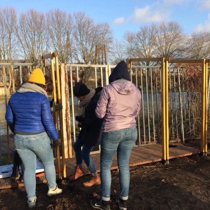 Durée du chantier : 4 journées. Merci au 6B (Côme) pour le bout de terrain et la mise à disposition de l’atelier, à l’Aset93 pour le contact, à la mission bidonville de Médecins du Monde, aux étudiants de l’Eav&t Paris-Est, à Pilar, aux habitant(e)s.