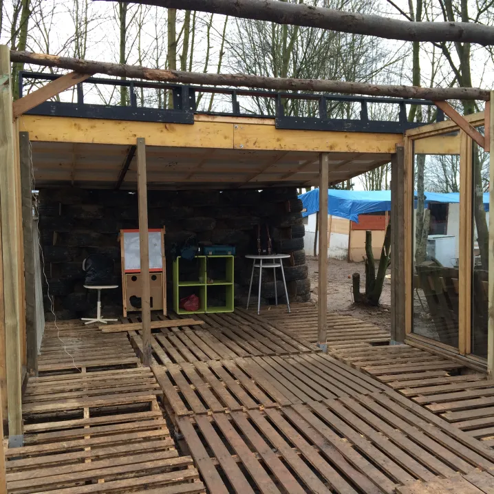 Le système constructif associe des palettes et bâches de récupération, ainsi que 12 bambous de bonne taille. Les palettes constituent des modules structurels pré-construits qui forment des alcôves tournées vers le paysage. Leur disposition le long d’une « nef » a permis d’associer un espace central collectif à des espaces plus intimes où des tables et des bancs fixes donnent aux enfants un espace de concentration individuel. On peut ainsi s’adosser, s’appuyer, et se sentir à l’intérieur dans la grande forêt, ou faire des jeux collectifs dans la partie centrale.