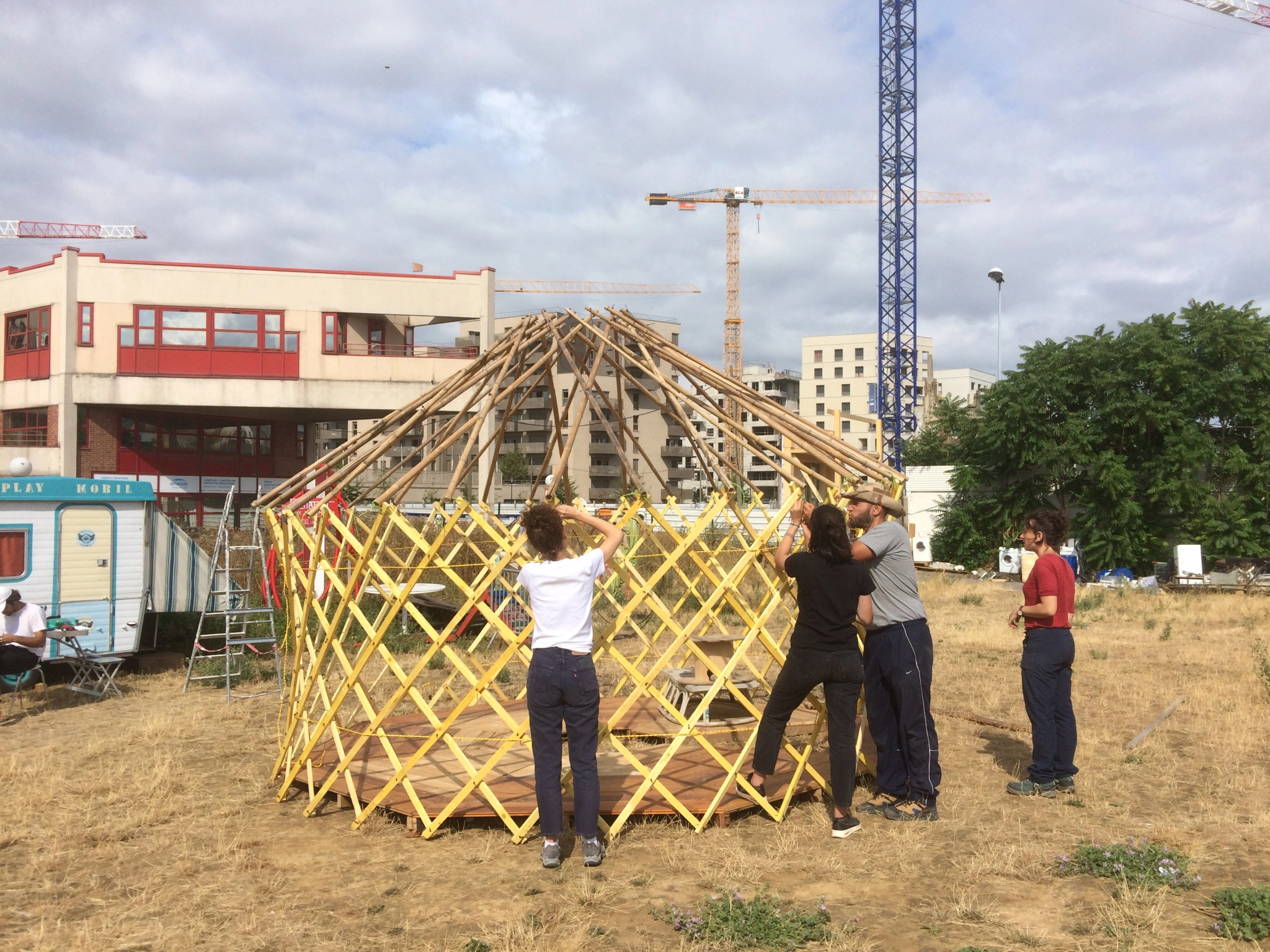 Ont participé au montage de la yourte avec Système b : les habitants (merci Dorina, Damien, la petite Antonia), des étudiants du cours « Bidonvilles et habitats précaires » de l’Eav&t, C.Siméon, T.Ysembert, J. Lacour. Ont participé au démontage de la yourte : P de Robillard, P. Condé, Anthony André, G. Clément et J. Mathiot de LaGonflée